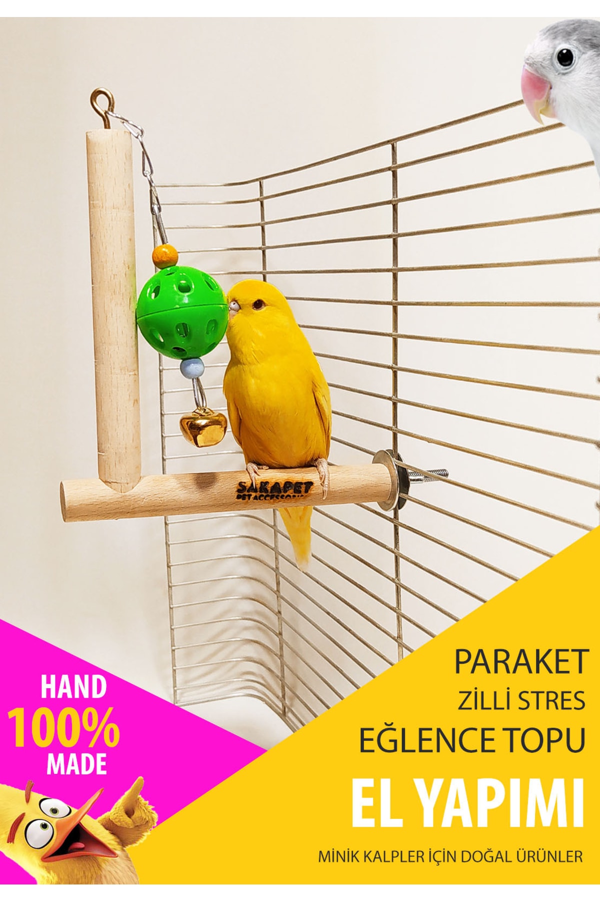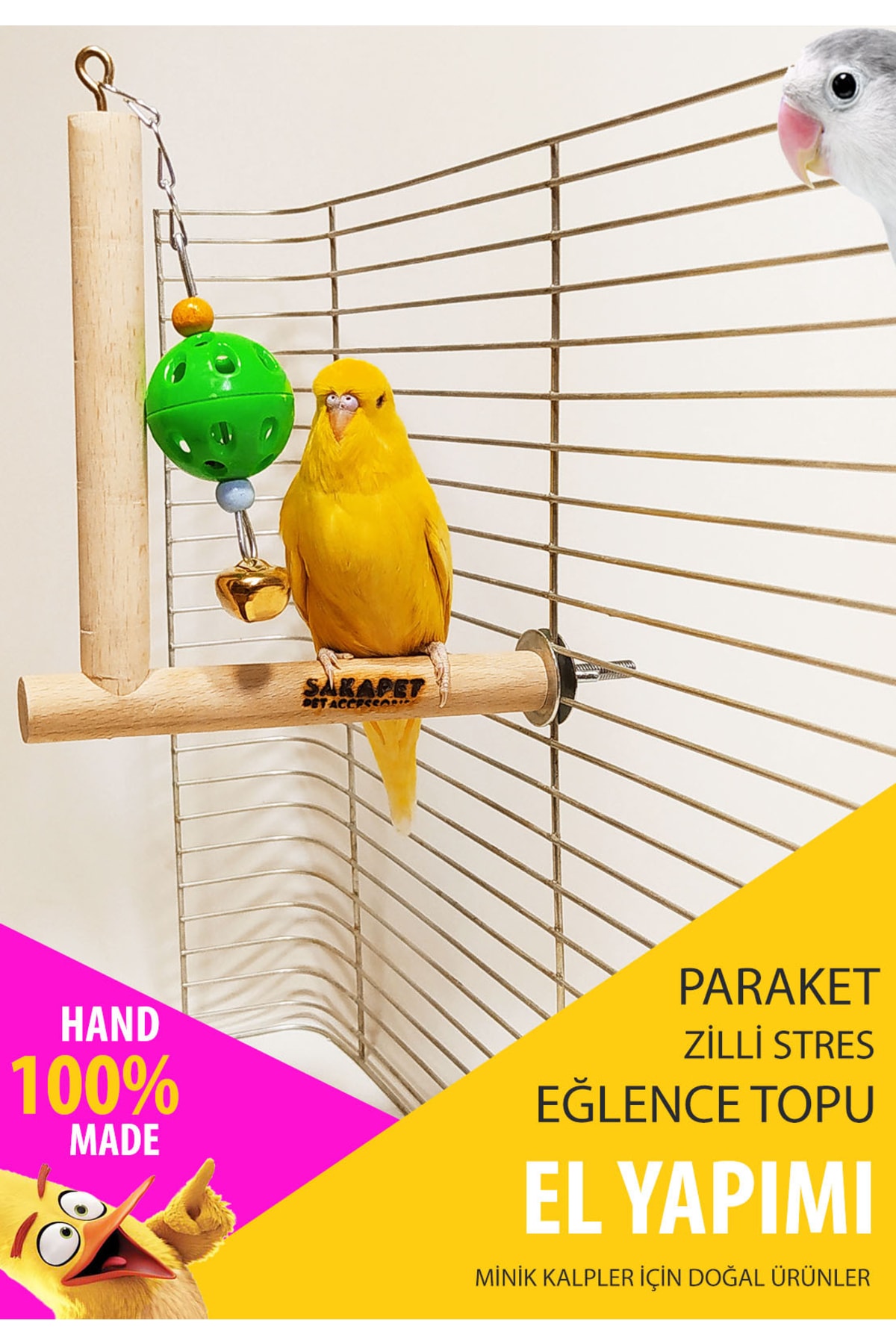 Muhabbet kuşlarının günlük tüneme, oyun ve hareket ihtiyaçları dikkate alınarak tasarlanan bu zilli stres eğlence oyuncağı, doğal ahşap tünek ve askılı zilli top kombinasyonundan oluşur. El yapımı üretimi sayesinde doğal, sade ve güvenli bir kullanım sunar.